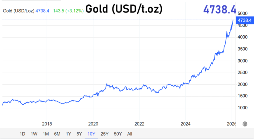 Die Dynamik am Edelmetallmarkt nimmt weiter Fahrt auf. Gold setzt seinen Aufwärtstrend fort und bewegt sich mit großen Schritten in Richtung der Marke von 5000 US-Dollar je Feinunze. Parallel dazu zieht auch Silber deutlich an. Anleger reagieren damit auf eine Gemengelage aus politischer Unsicherheit, geopolitischen Spannungen und wachsender Nervosität an den Finanzmärkten.
