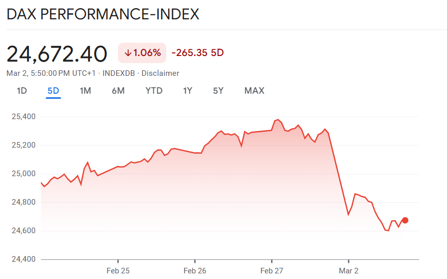 Der Wochenstart verlief für den deutschen Aktienmarkt ausgesprochen schwach. Noch bevor der Handel an der Wall Street offiziell eröffnet wurde, weiteten sich die Verluste in Frankfurt spürbar aus. Der Dax sackte um 2,4 Prozent oder knapp 600 Punkte ab und fiel auf 24.688 Zähler zurück. Damit verzeichnete das Börsenbarometer eine der deutlichsten Tagesbewegungen der vergangenen Wochen.