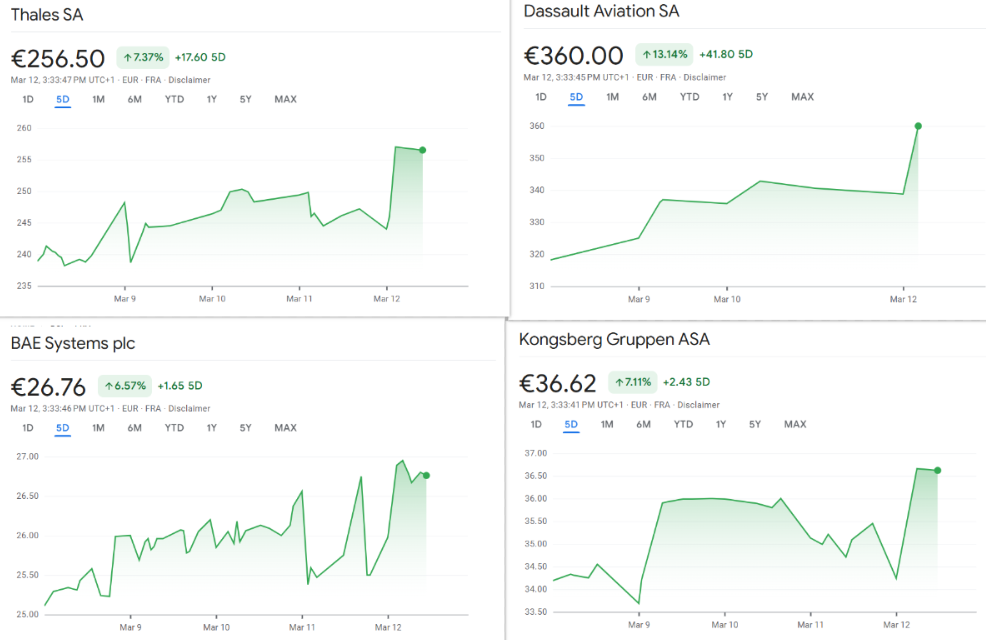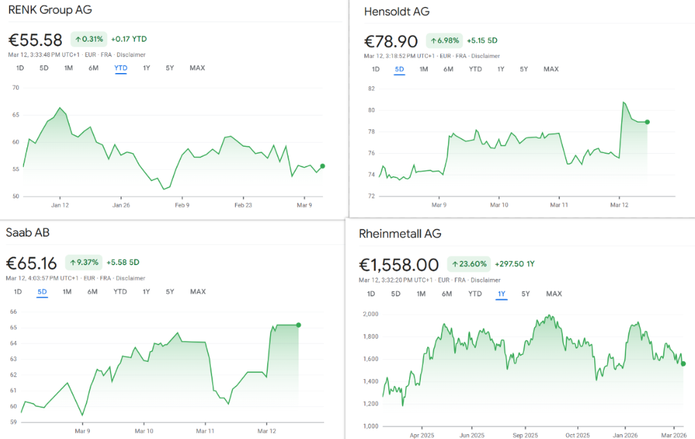 Die Kursgewinne setzten sich auch in anderen europäischen Märkten fort. Die britische BAE Systems sowie die norwegische Kongsberg Gruppen stiegen jeweils um 3 Prozent. Beide Unternehmen gelten als breit aufgestellte Verteidigungsanbieter mit starker Präsenz in unterschiedlichen militärischen Schlüsselbereichen.
