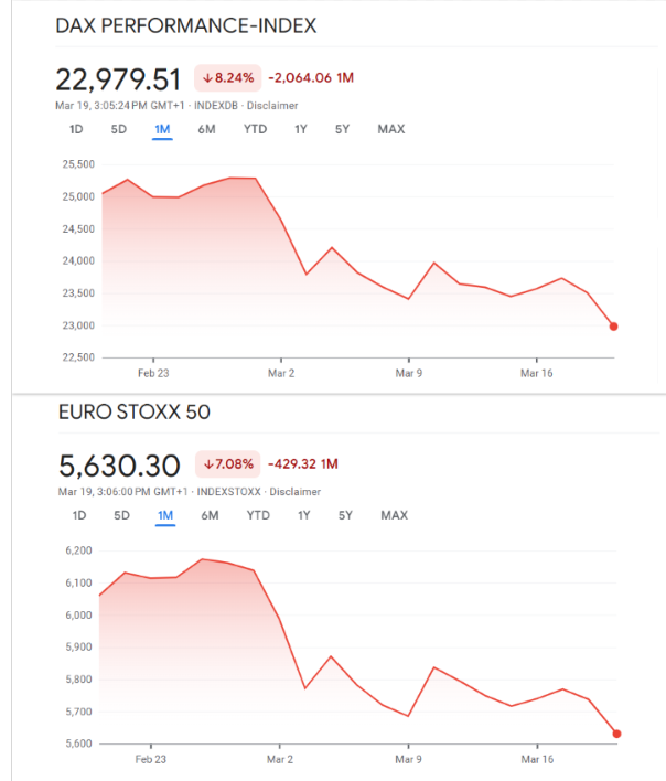 Auch auf europäischer Ebene zeigt sich ein ähnliches Bild. Der EuroStoxx50 gab um 2,4 Prozent nach und notierte bei 5.597 Punkten.