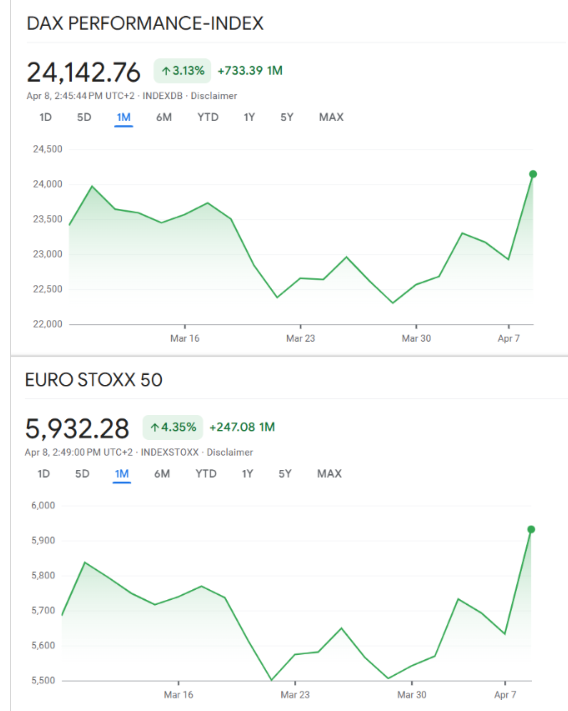 Der Dax sprang um fast 5 Prozent nach oben und stieg auf 24.050 Punkte. Auch der Euro-Stoxx-50 legte in ähnlicher Größenordnung zu und kletterte ebenfalls um fast 5 Prozent auf 5.911 Punkte. Allein diese beiden Zahlen zeigen, wie stark die Erleichterung unter Investoren ausfiel. Nach der vorangegangenen Kriegs- und Ölpreisangst wirkte die Aussicht auf eine vorläufige Beruhigung wie ein Signal, dass das schlimmste Szenario zunächst vermieden werden könnte.