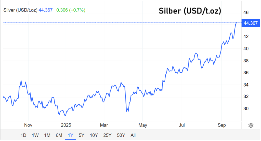 Nicht nur Gold, auch Silber befindet sich im Höhenflug. Der Preis erreichte am Montagabend 44,11 US-Dollar je Unze – der höchste Stand seit 14 Jahren. Auf Jahressicht beläuft sich das Plus bereits auf über 50 Prozent. Diese Entwicklung zeigt, dass Anleger derzeit verstärkt auf den gesamten Edelmetallsektor setzen und Alternativen zu klassischen Anlageformen wie Anleihen oder Aktien suchen.