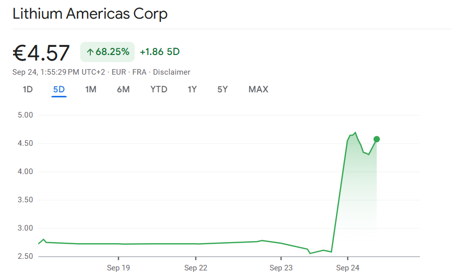 Die Aktie von Lithium Americas erlebte nachbörslich einen regelrechten Höhenflug: Innerhalb weniger Stunden legte das Papier um fast 90 Prozent zu. Auslöser war ein Bericht, wonach die US-Regierung erwägt, sich mit bis zu 10 Prozent am Unternehmen zu beteiligen. Damit rückt das Lithium-Großprojekt Thacker Pass in Nevada, das eine Investition von knapp drei Milliarden US-Dollar umfasst, erneut in den Fokus der Finanzmärkte.