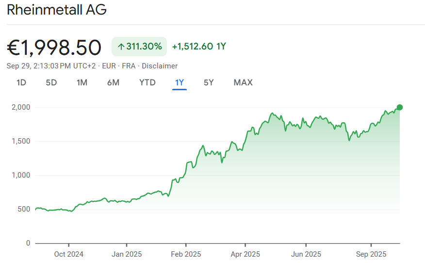 Die Rheinmetall-Aktie hat erstmals die Marke von 2000 Euro überschritten. Der Kurs kletterte zeitweise auf 2001 Euro, bevor er sich bei 1999 Euro einpendelte – ein Plus von 2,0 Prozent gegenüber dem Vortag. Damit zählt das Papier zu den auffälligsten Gewinnern am deutschen Aktienmarkt und wird zunehmend als Symbol für die Stärke der heimischen Rüstungsindustrie wahrgenommen.