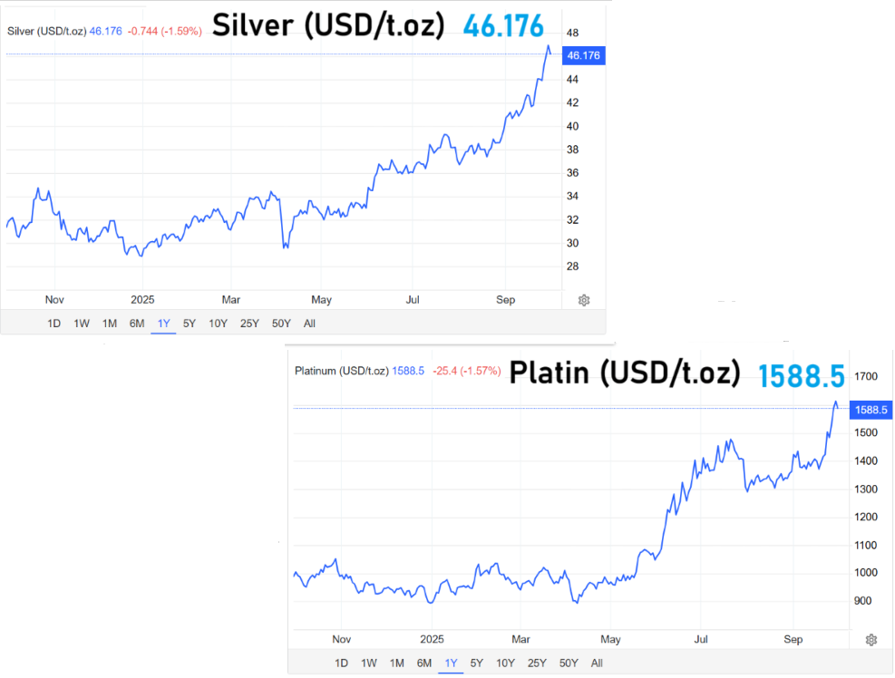 Während Aktienkurse schwächeln, gewinnt Gold an Attraktivität. Das Edelmetall legte deutlich zu und setzte seinen Aufwärtstrend fort. Experten sehen in Gold nicht nur einen Schutz vor Inflation, sondern auch eine Absicherung gegen politische Risiken. Parallel dazu verzeichneten auch Silber und Platin steigende Notierungen. Alle drei Metalle bestätigen damit ihren Ruf als klassische „sichere Häfen“ in unsicheren Zeiten.