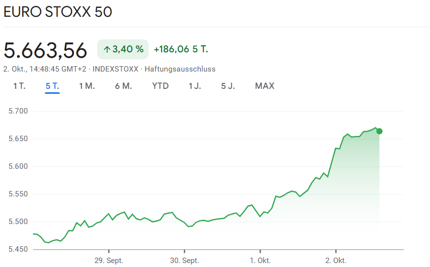 Schon im frühen Handel zeigten sich starke Impulse. Der EuroStoxx50 sprang zeitweise auf 5.643,85 Punkte und markierte damit einen neuen Spitzenwert. Der Dax bewegte sich ebenfalls in Rekordnähe und legte zwischenzeitlich um 0,9 Prozent auf 24.338 Punkte zu. Sein bisheriges Allzeithoch liegt bei 24.631 Punkten – die Marke ist damit in Reichweite.