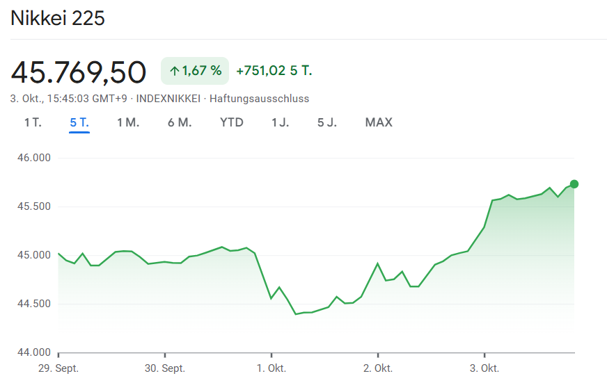 Zusätzlich rückt die politische Zukunft Japans ins Zentrum. Am Wochenende soll die regierende Liberaldemokratische Partei (LDP) einen neuen Ministerpräsidenten bestimmen. Nach dem Rücktritt von Shigeru Ishiba erwarten Investoren, dass der Nachfolger Stabilität bringt und klare Signale für die Wirtschaft setzt.