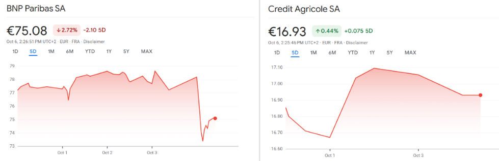 Der politische Schock machte sich unmittelbar an den Börsen bemerkbar. Der CAC-40-Index verlor 1,5 Prozent und war damit der schwächste Leitindex Europas. Besonders stark betroffen waren französische Bankenwerte: Société Générale brach um 6,7 Prozent ein, BNP Paribas um 3,4 Prozent und Crédit Agricole um 2,9 Prozent.