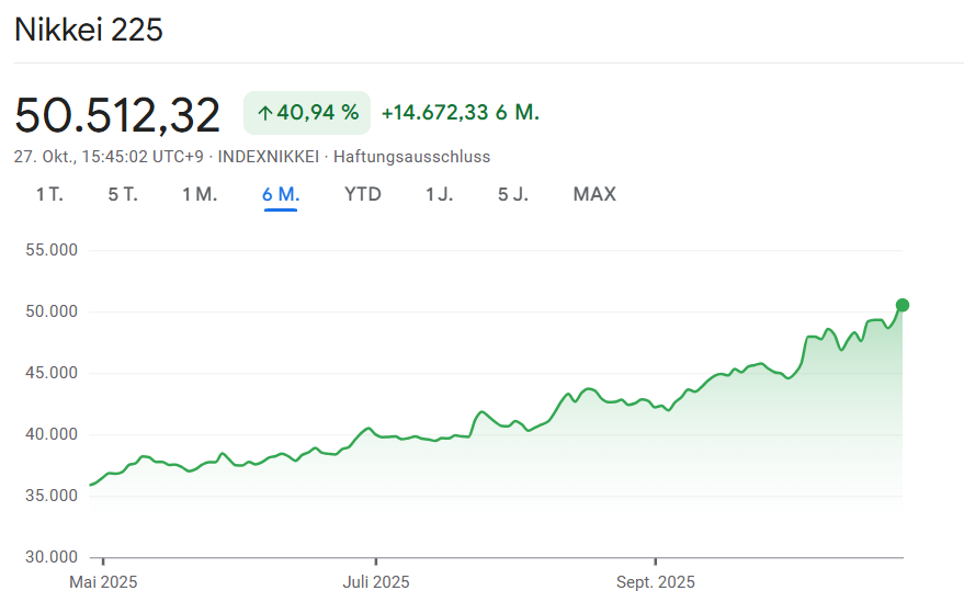 An den internationalen Finanzmärkten herrscht zum Wochenbeginn deutlicher Optimismus. Die Aussicht auf eine Annäherung im Handelskonflikt zwischen den USA und China sorgt für steigende Kurse in Asien und positive Stimmung an den Terminmärkten weltweit. Besonders in Japan verzeichnen Anleger ein historisches Ereignis: Der Nikkei 225-Index überschritt erstmals in seiner Geschichte die Marke von 50.000 Punkten.
