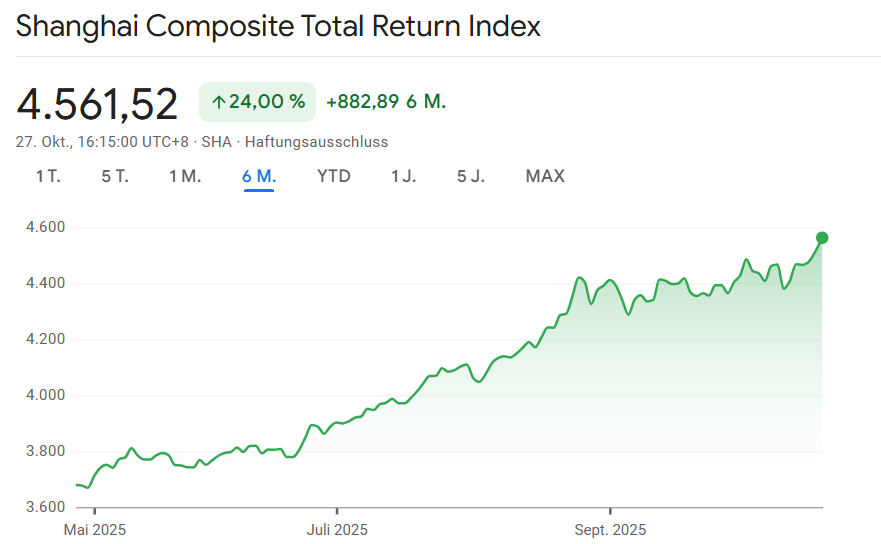 Auch an den Börsen auf dem chinesischen Festland zeigt sich eine deutliche Aufwärtsbewegung. Der Shanghai Composite Index legte um 1,0 Prozent auf 3.991 Punkte zu, während der CSI 300, der die größten Unternehmen in Shanghai und Shenzhen abbildet, um 1,1 Prozent auf 4.709 Punkte stieg.