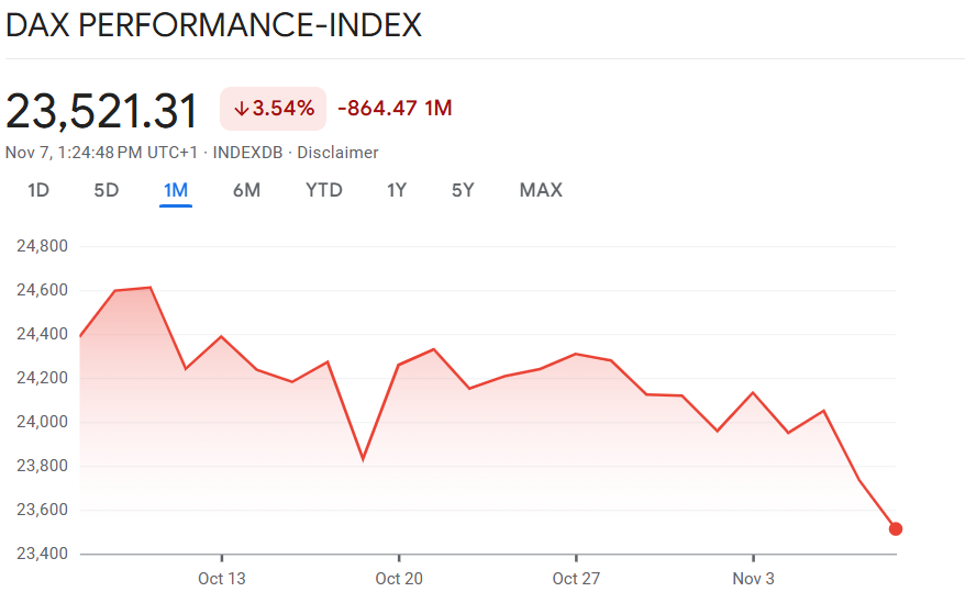 Nach einem zunächst freundlichen Start hat der Dax am Freitag deutlich an Boden verloren. Der Leitindex sank im Tagesverlauf um 0,8 Prozent auf 23.538 Punkte und markierte ein Tief bei 23.477 Punkten. Damit konnte er die anfängliche Erholung nicht halten und fiel zurück auf das Niveau der Vorwoche. Marktteilnehmer sprachen von einer spürbaren Zurückhaltung der Anleger nach mehreren schwankungsreichen Handelstagen.