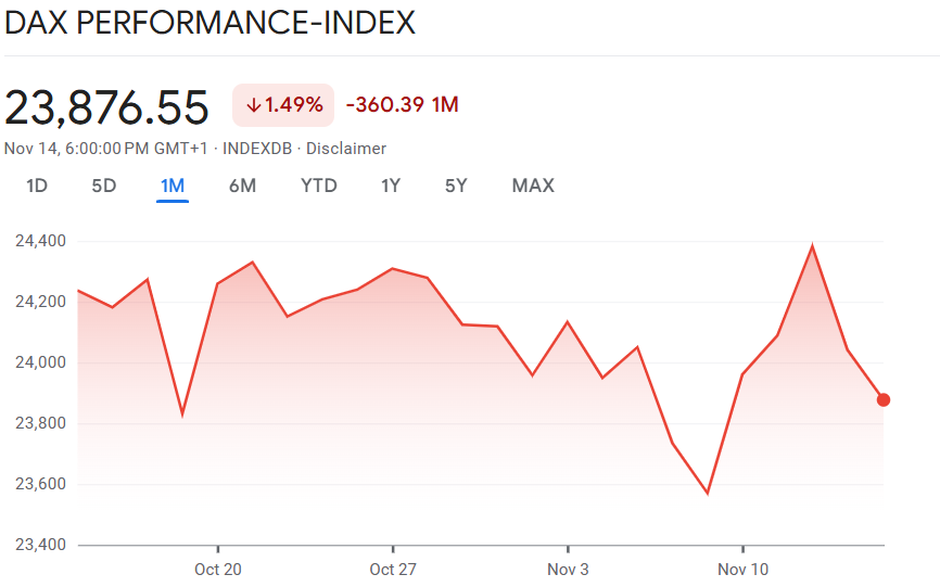 Auch an den europäischen Märkten setzte sich die schwächere Tendenz fort. Der DAX verlor am Freitagmittag 1,2 Prozent und fiel auf 23.756 Punkte, während der EuroStoxx 50 um 1,1 Prozent auf 5681 Punkte nachgab.