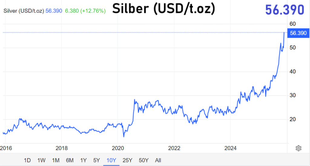Der Handel an den Rohstoffbörsen zeigte sich am Freitag ausgesprochen bewegt. Der Preis für Gold kletterte erneut spürbar und erreichte mit 4.200 US-Dollar je Feinunze den höchsten Stand seit Mitte November. Parallel dazu setzte Silber seine dynamische Aufwärtsbewegung fort und notierte mit 55,18 US-Dollar auf einem neuen Rekordniveau. Händler verwiesen auf eine Mischung aus technischen Marktverwerfungen, geldpolitischen Erwartungen und geopolitischen Unsicherheiten, die das Interesse an sicheren Anlagen verstärkten.